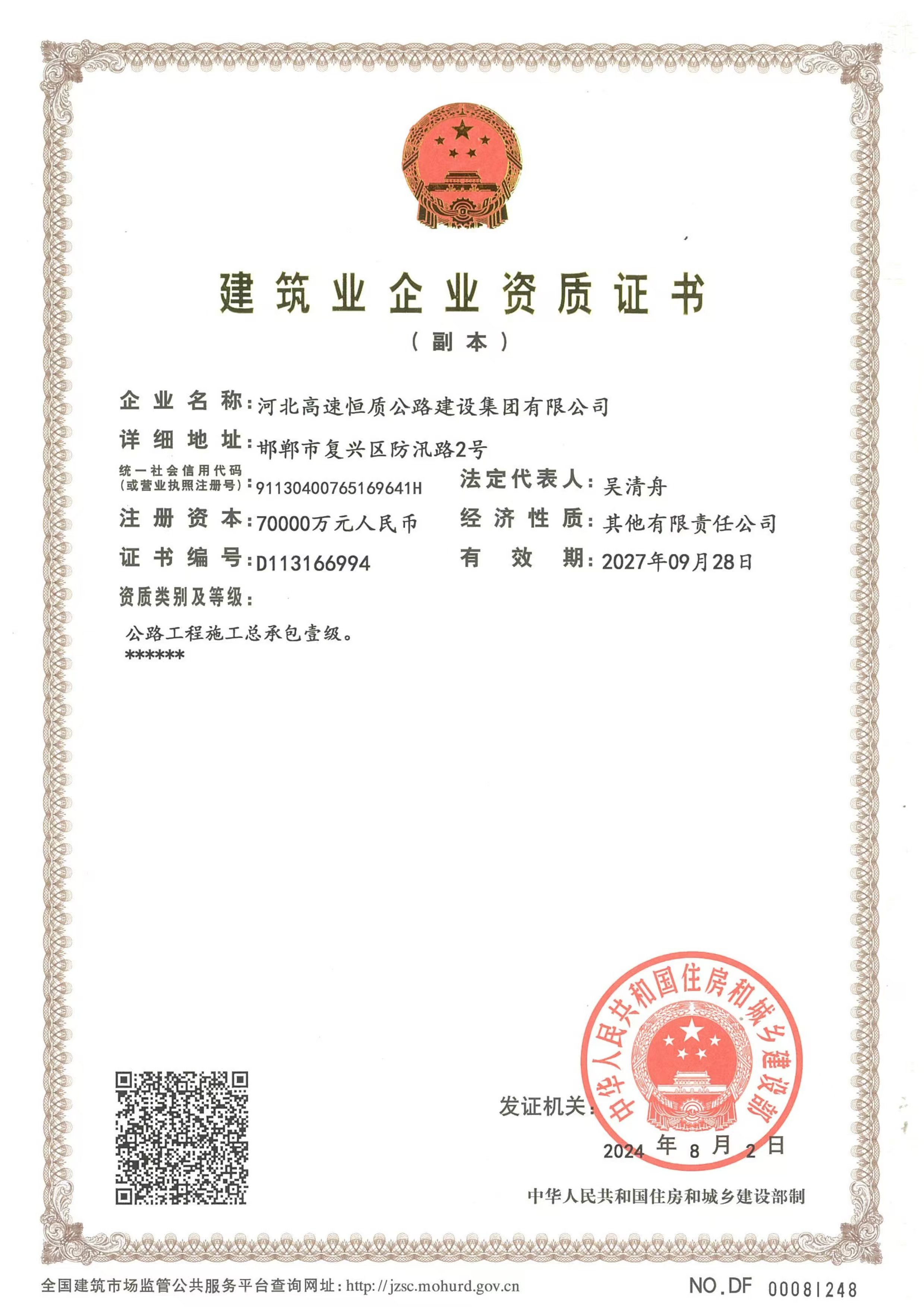 河北高速恒質(zhì)公路建設(shè)集團(tuán)有限公司始建于2004年,前身是邯鄲市恒質(zhì)公路建設(shè)集團(tuán)有限公司。2024年7月成為河北高速公路集團(tuán)有限公司二級(jí)子公司,現(xiàn)有職工500余人,下轄18家子公司13個(gè)分公司,參股公司3家 ,注冊(cè)資本7億元,是一家集公路工程施工、路用材料研發(fā)生產(chǎn)、試驗(yàn)檢測(cè)、瀝青貿(mào)易、公鐵物流于一體的多元化、綜合性單位,國(guó)家級(jí)高新技術(shù)企業(yè),河北省專(zhuān)精特新中小企業(yè),河北省首家瀝青拌合環(huán)保引領(lǐng)性企業(yè)。公司擁有公路工程總承包壹級(jí)、公路交通工程(公路安全設(shè)施)專(zhuān)業(yè)承包壹級(jí)、機(jī)電工程施工總承包貳級(jí)、電力工程施工總承包貳級(jí)、市政公用工程施工總承包貳級(jí)、建筑工...